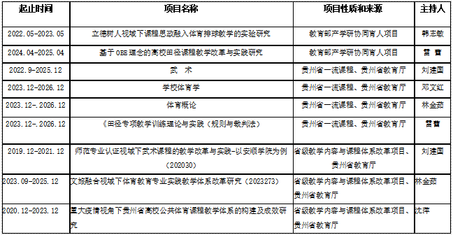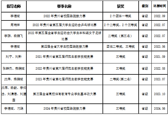 获国家级少数民族传统体育运动二等奖1项;省级一等奖10项、二等奖22项,三等奖17项,作品《仡佬族斗鸡舞》获得中华人民共和国第十届少数民族传统体育运动会表演项目二等奖。作品《屯堡地戏》获得贵州省第七届大学生艺术展演活动戏剧类一等奖。